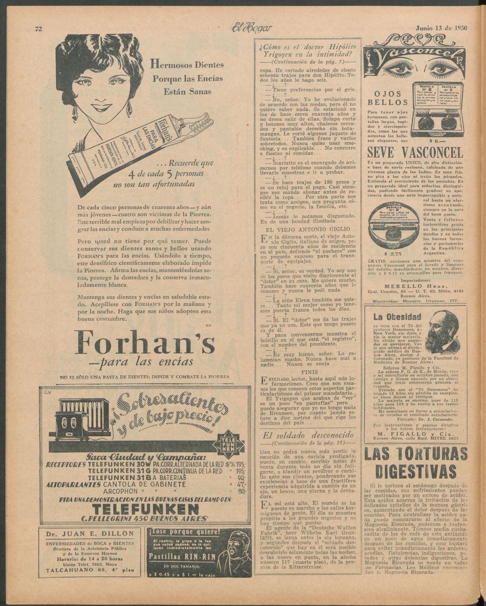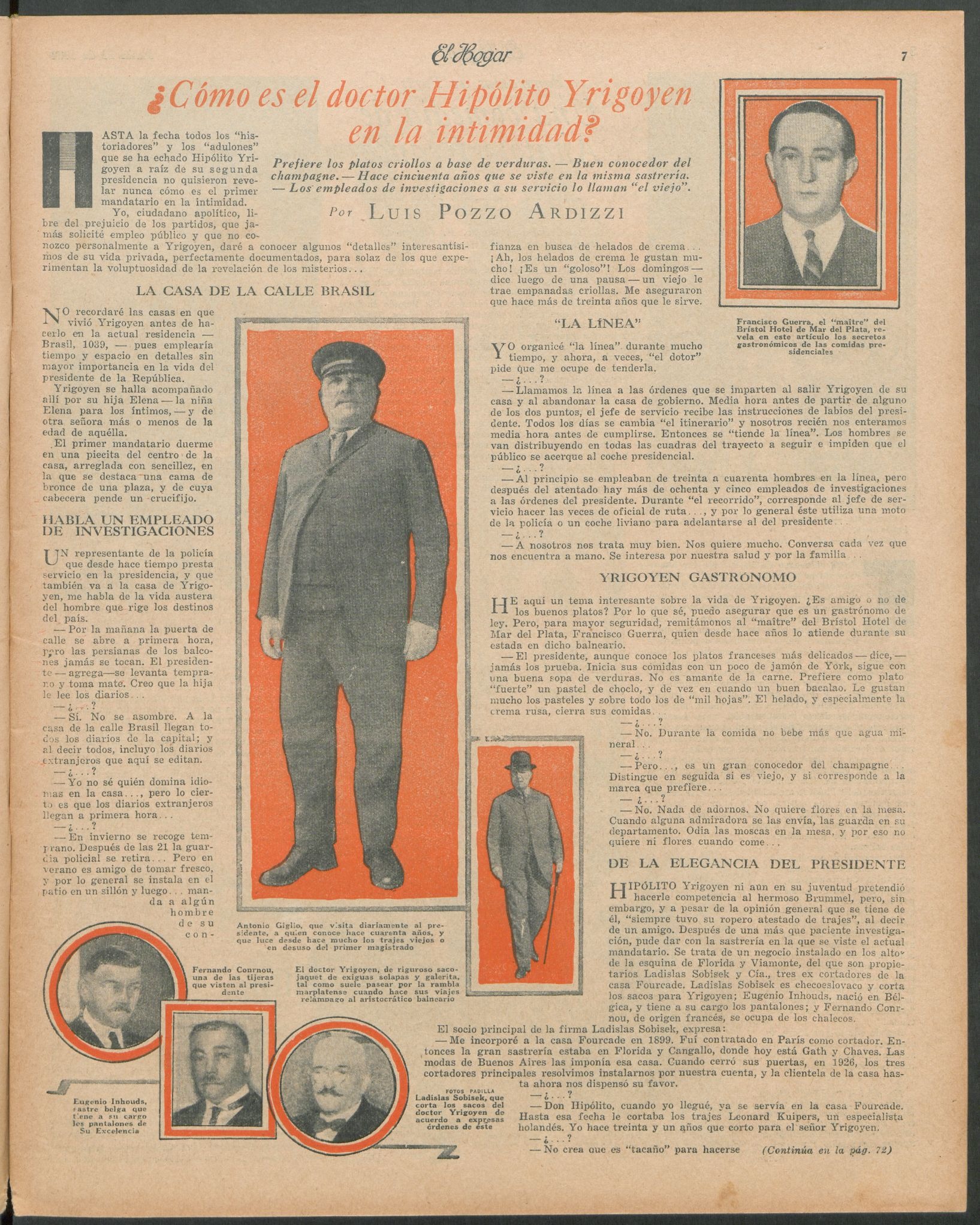 Hipólito Yrigoyen ni aun en su juventud pretendió hacerle competencia al hermoso Brummel, pero, sin embargo, y a pesar de la opinión general que se tiene de él, "siempre tuvo su ropero atestado de trajes", al decir de un amigo. Después de una más que paciente investigación, pude dar con la sastrería en la que se viste el actual mandatario. Se trata de un negocio instalado en los altos de la esquina de Florida y Viamonte, del que son propietarios Ladislas Sobleck y Cía., tres ex cortadores de la casa Fourcade.