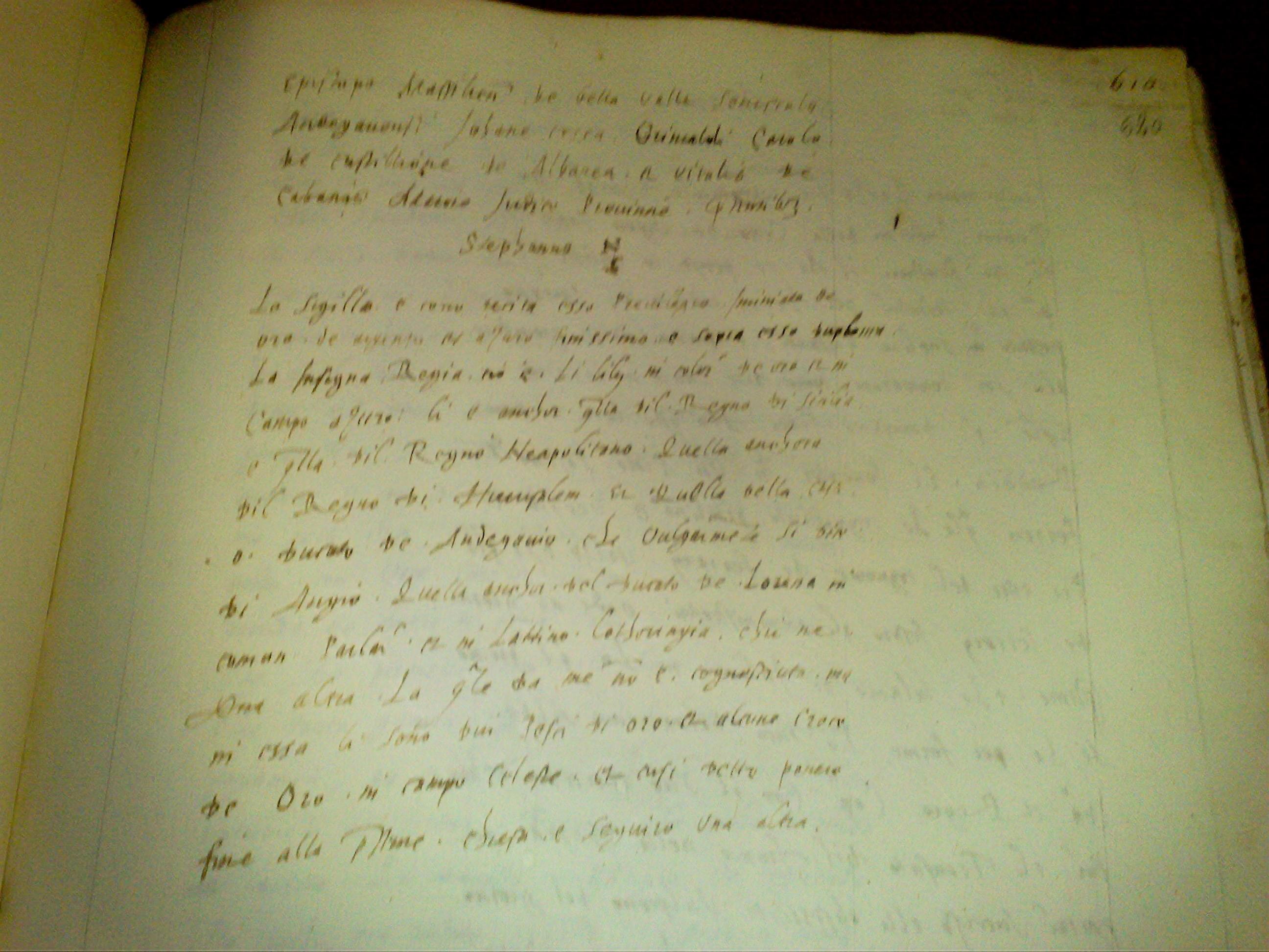 "El Sello es como recita ese Privilegio provisto de oro de plata ni oscuro finísimo a sobre eso impresa La Insignia Regia. es decir Los lirios [Flores de Lis] en color de oro en Campo azul le es concedida de la Majestad del Reino de Sicilia y por la del Reino Napolitano. Aquella todavía del Reino de Jerusalén y Aquella de la C.[asa] o Ducado de Anjou... quien de Dos otra La cual de mí no es conocida pero en esa le son dos Peces de oro en algunas Cruz de Oro en campo Celeste [probablemente el escudo del Ducado de Bar]."