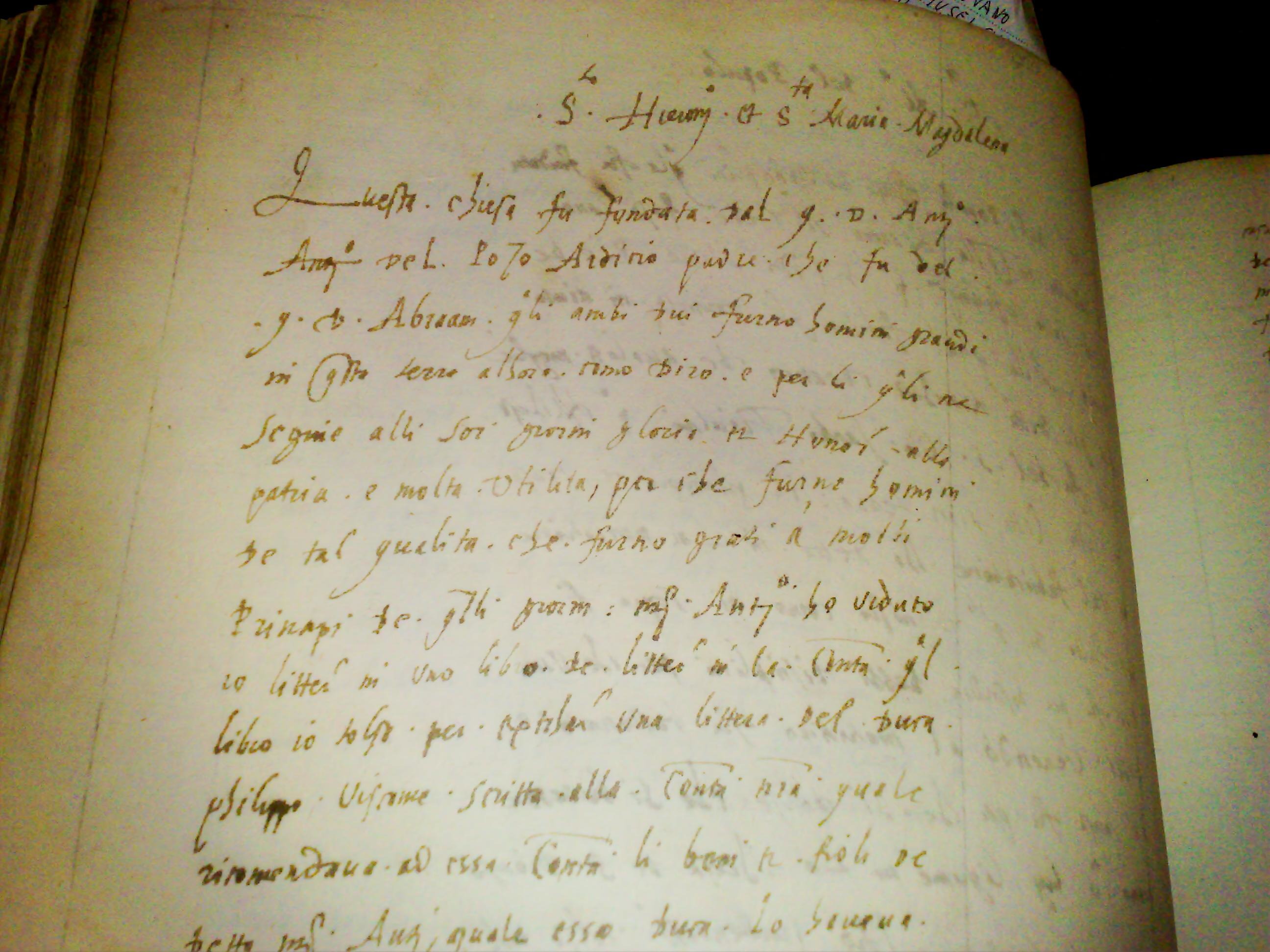Questa chiesa fu fundata dal q. d. [quondam domino] Anto. [Antonio] Ardic. [Ardicio] del Pozo Ardicio padre che fu del q. d. Abraam. gli ambi dui furno homini grandi in q[ues]ta terra et altrove come diro. e per la g.lia [gloria] ne segue alli soi giorni gloria et Honore alla patria. e molta Utilità, per che furno homini de tal qualità. che furno grati a molti Principi etc. gli giorni : ms. Anto. ho viduto io littere in uno libro de littere in la Cam.a [Camera] g.l libro io tolgo per copiar una littera del Duca Philippo Visconte scritta alla Comta [Comunità] nra [nostra] quale raccomandava ad essa Comta li beni et fioli de detto ms. Ant.o; quale esso Duca Lo teneva..."
