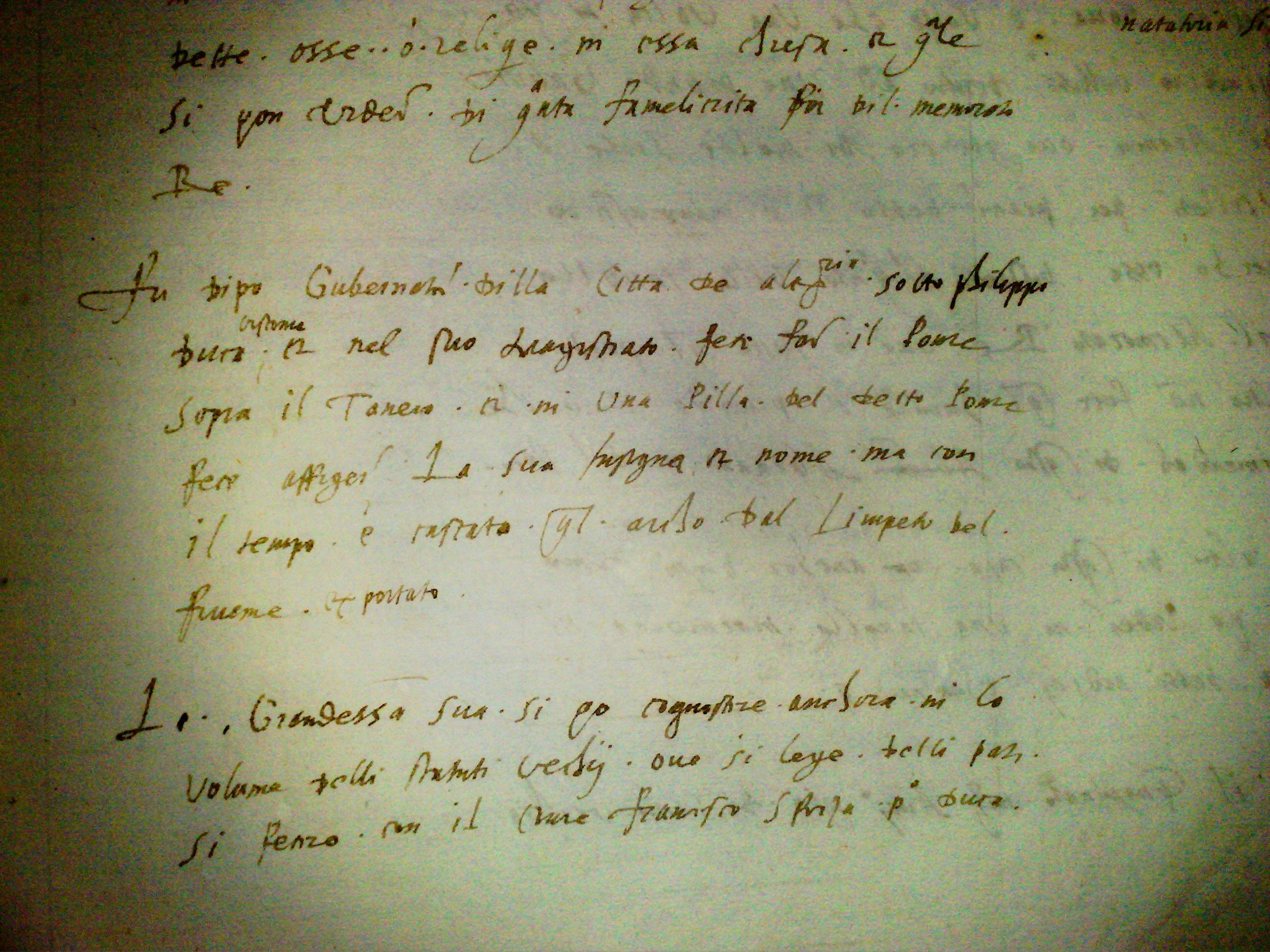 La Grandeza suya se puede conocer todavía en el Volumen de los Estatutos viejos, donde se lee de las paces [tratados de paz] [que] se hicieron con el Conde Francesco Sforza 1.er Duque."