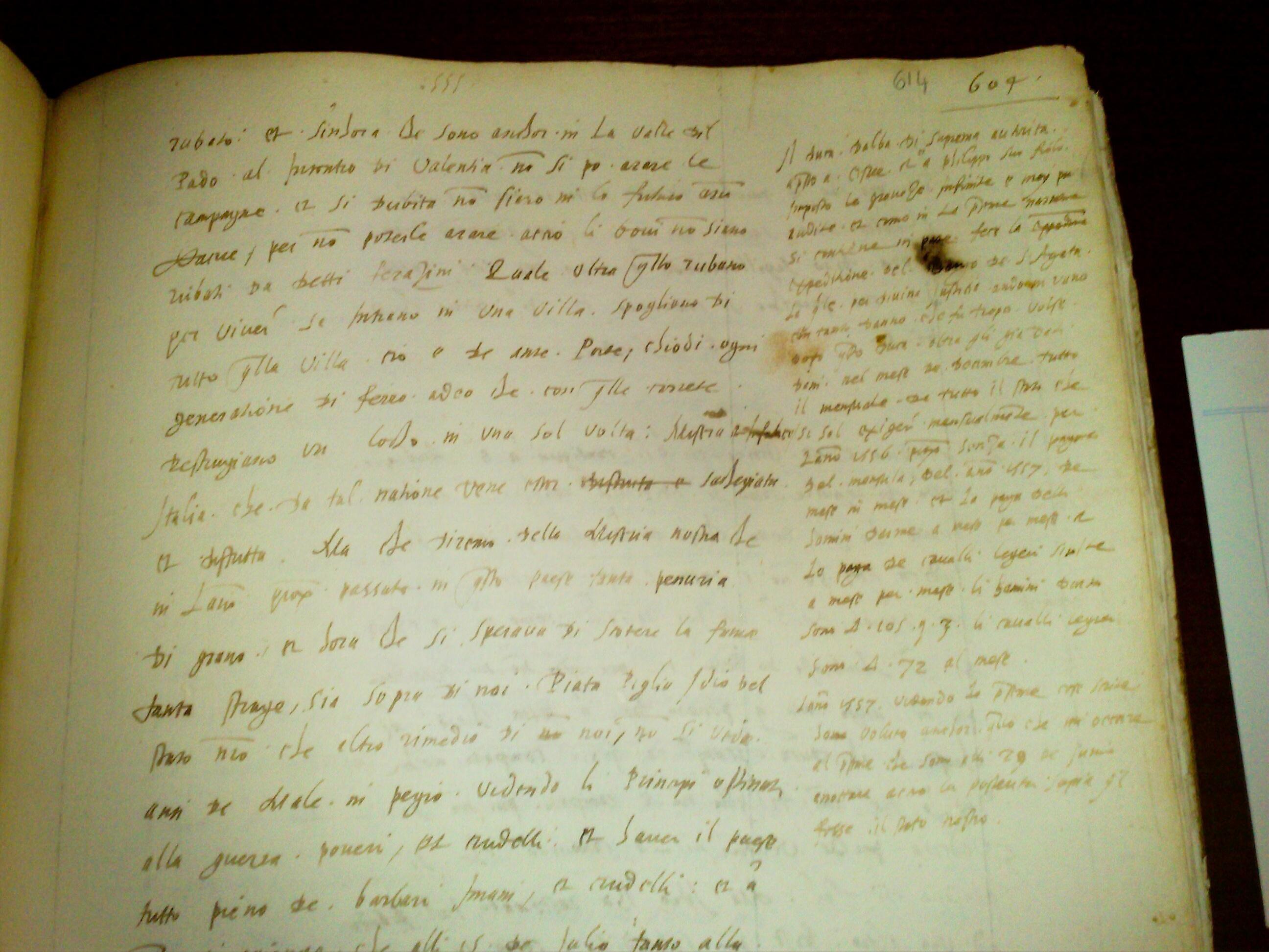 "... pegio [peggio] ora se da muro era anforciato[?] delli soi mali, che li presse o volesse renderli ragione. per se si mene ora delli Superiori. Qui in qti [questi] tempi erane gl'il locho di refugio come m [mi] lo Monferrato o nel paeso del Duca di Savoia Sau... niuno corso li e rifugio per che tutti gli paeso sono tutti arsi bruciati in ardente guerra. Solo gli e che promette, sino al p[ri]mo giorno non si monde grano riso mi pare il tasso Reale. ccio [comincio] alli poveri tratto gl'hanno gli grani non... fossero tutti in ??