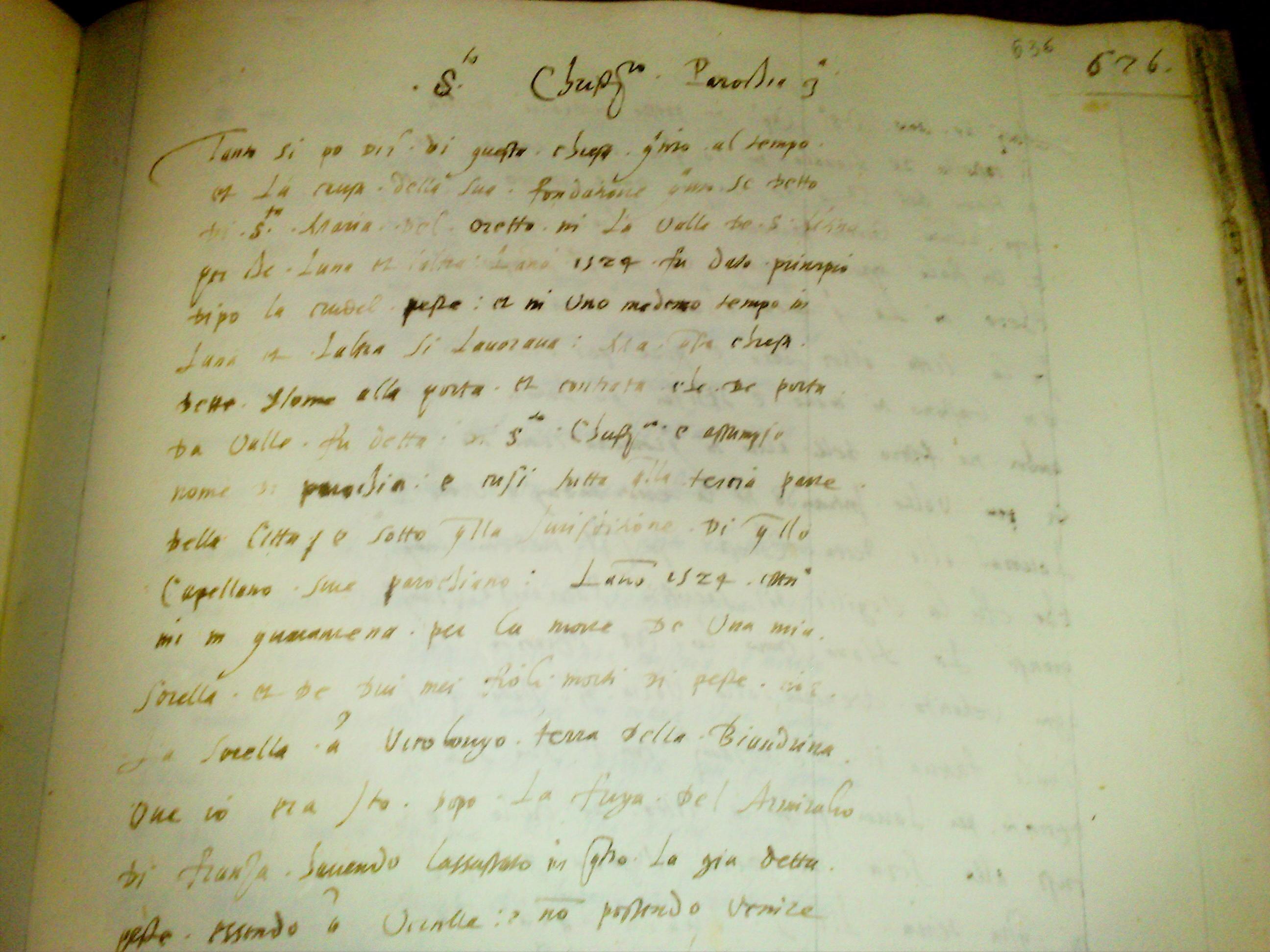 "Por cuanto se encuentran en la primera descripción [catastro anterior] muchas tierras que son de la iglesia de Santa María de Sotto [de Abajo], dicha de los Principales de los Nobles del Pozzo y antiguos [ancestros], con obligación de hacer decir misa en la iglesia de Santa Magdalena en la comarca [barrio] que va de la calle de Griona a la calle de San Martín y da [desemboca] sobre la plaza de la iglesia de San Francisco... [cambiando] por la vía la obligación que antes era de decir tal misa en la dicha iglesia de Santa María de Sotto... [vinculada a la] Abadía de San Maiolo... la Gracia.