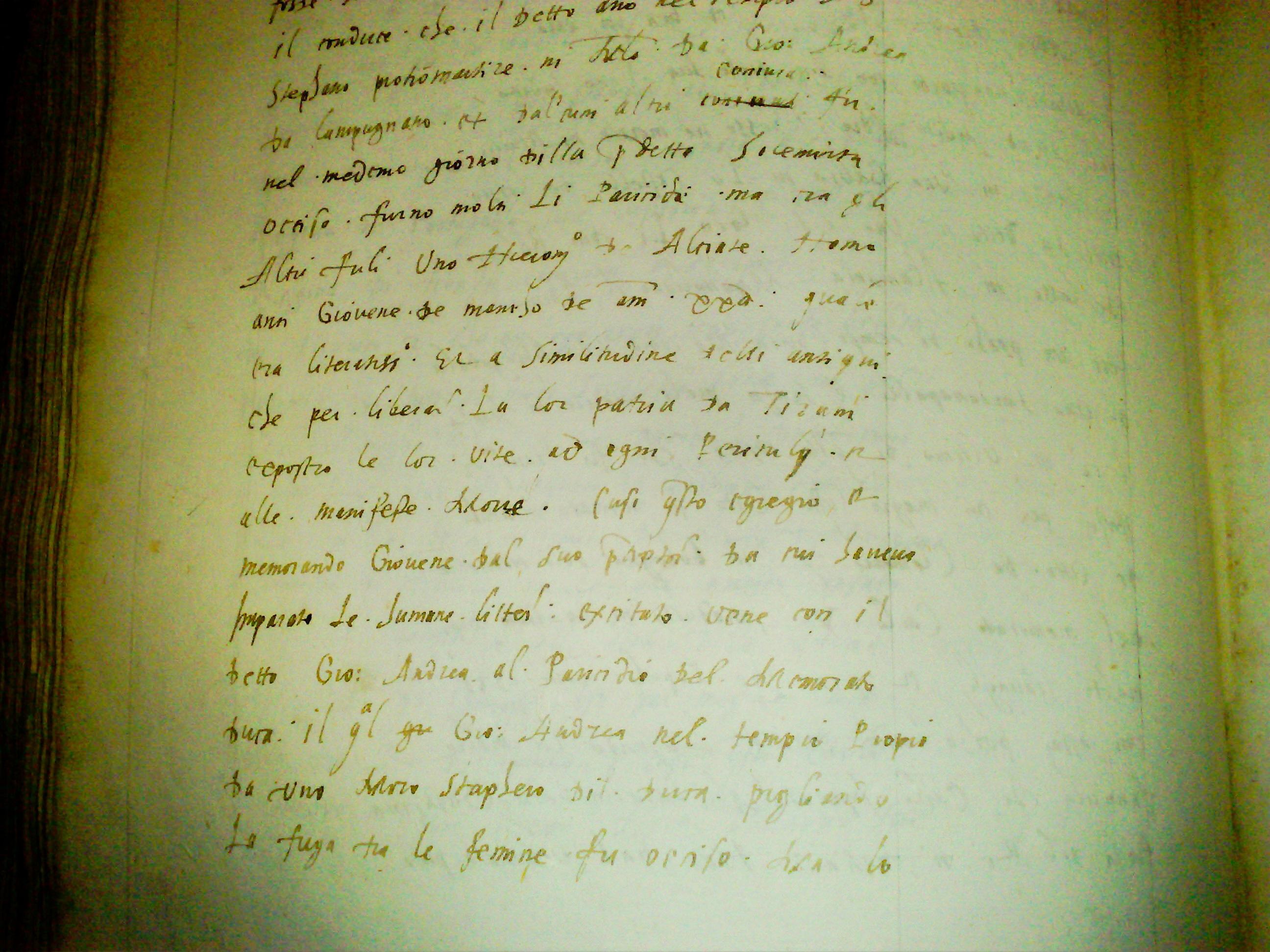 "...L'ano 1524. che mi in quarantena per la morte de Una mia sorella et de dui mei fioli morti di peste in la Sorella a Vicolongo terra della Biandrina ove io via sto dopo la fuga del Armiralio di Franza. Havendo lassato in ptro [pietro?] La gia detta peste. essendo a Orellie: no possendo venire..."