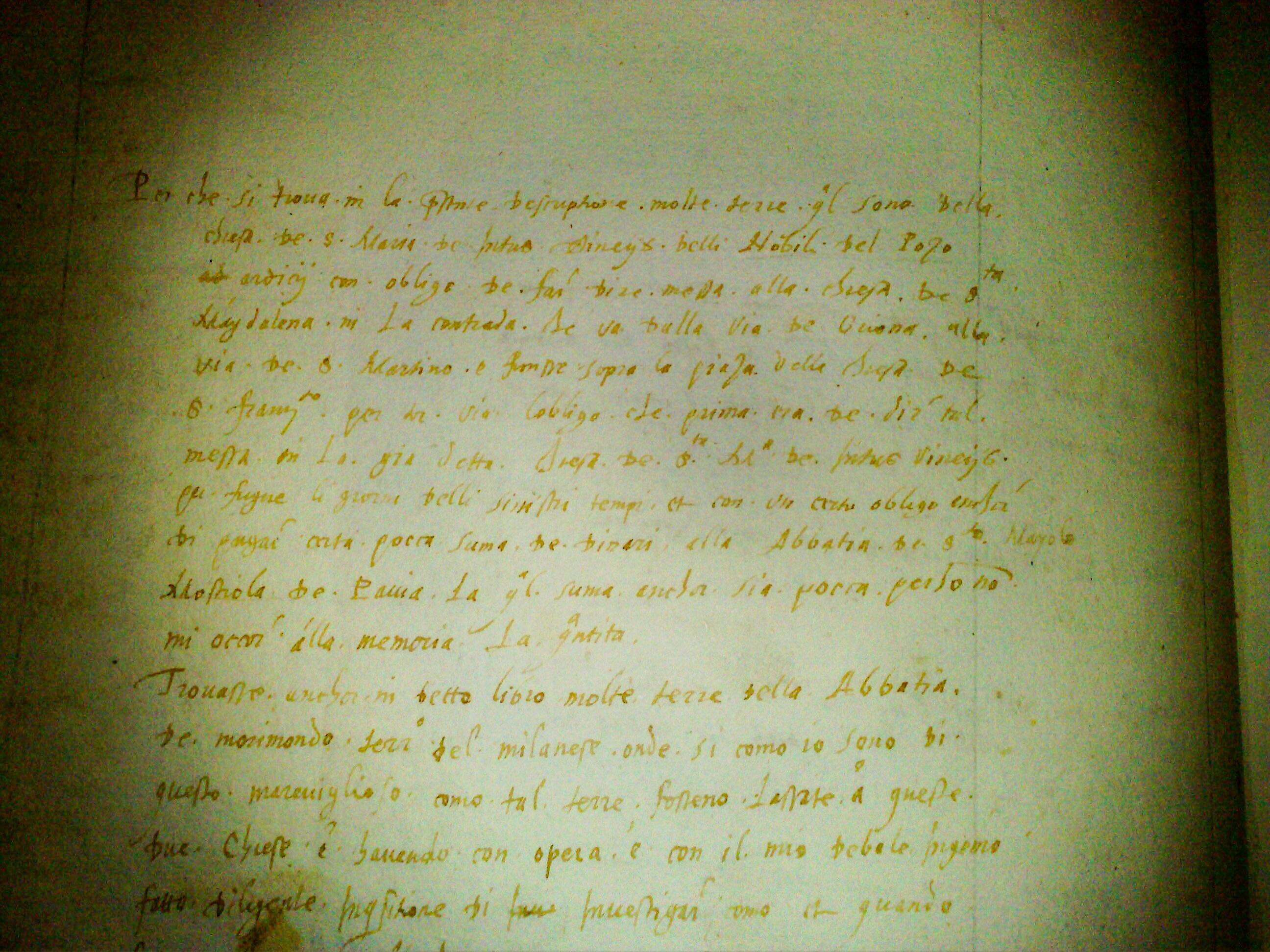 Trovasi ancha in detto libro molte terre della Abbatia de Morimondo terra del milanese, onde si como io sono di questo maraviglio o como tal terre fossero date a queste due Chiese e havendo con opera e con il mio debole ingegno fatto diligente inquisitione si come ... e quando..."