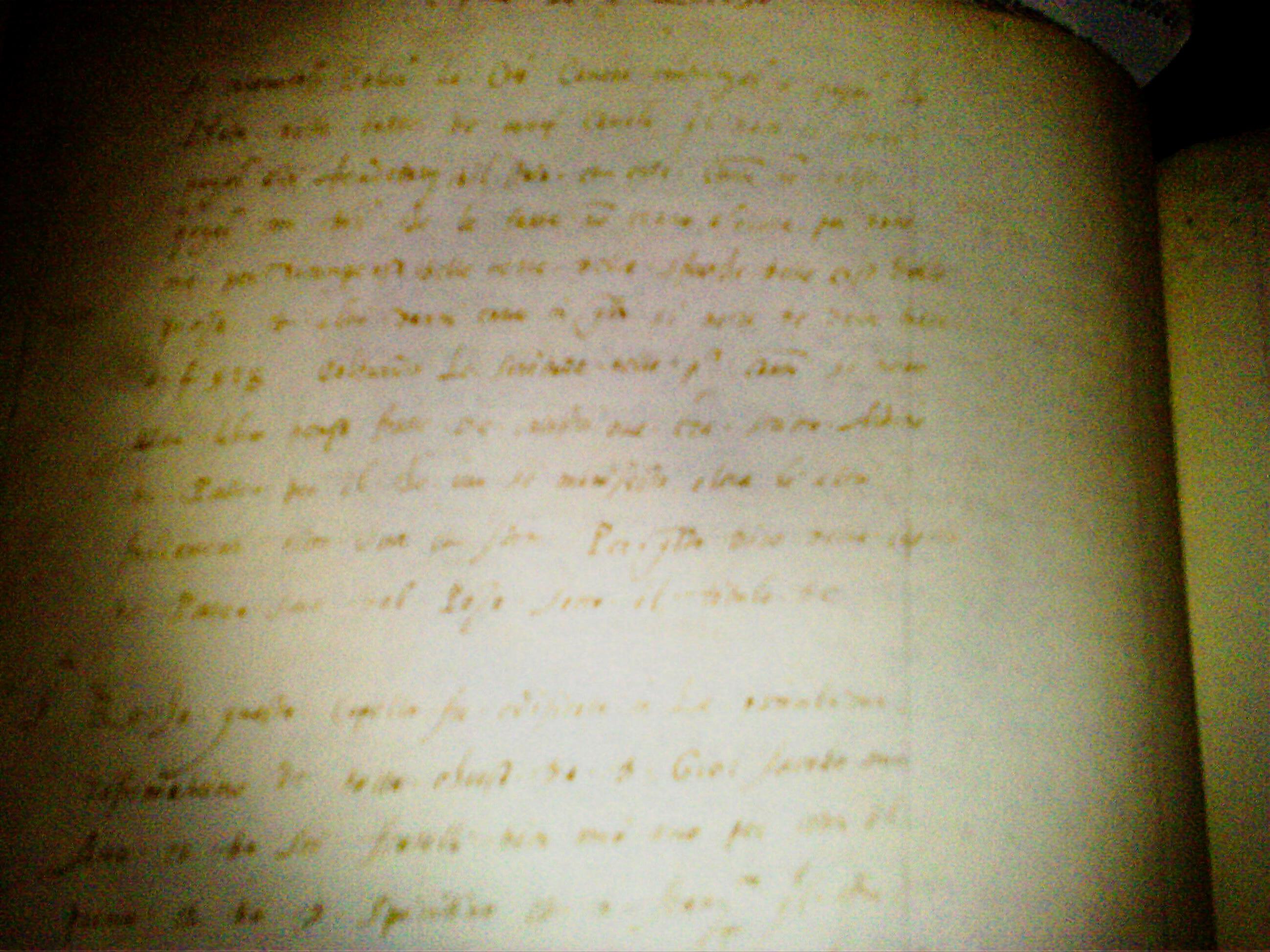 "...El año 1524. que [me tuvo] a mí en cuarentena por la muerte de Una mi hermana y de dos mis hijos muertos de peste en la [finca] Sorella a Vicolongo, tierra de la Biandrina, donde yo vía [estaba refugiado] estoy después de la fuga del Almirante de Francia. Habiendo dejado en [piedra?] La ya dicha peste. estando a Orellie: no pudiendo venir..."