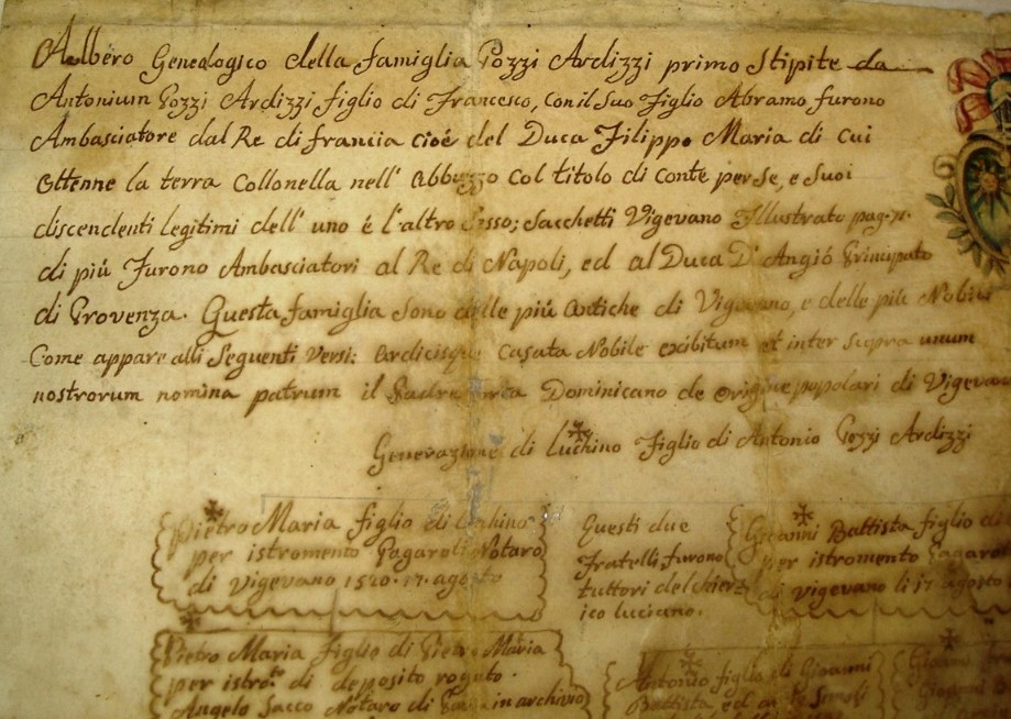"Albero Genealogico della Famiglia Pozzi Ardizzi primo Stipite da Antonium Pozzi Ardizzi figlio di Francesco, con il Suo figlio Abramo furono Ambasciatore dal Re di francia cioè del Duca Filippo Maria di cui Ottenne la terra Colonnella nell' abbruzzo col título di conte per Se, e Suoi discendenti Legittimi dell' uno e l'altro Sesso; Sacchetti Vigevano Illustrato pag. 76. di più Furono Ambasciatore al Re di Napoli, ed al Duca D'Angiò Principato di Provenza. Questa famiglia Sono delle più Antiche di Vigevano, e delle più Nobili Come appare alli Seguenti Versi: ardiciscue Casata Nobile exibitum et inter sopra unum nostrorum nomina patrum il Padre mca Dominicano de origine popolari di Vigevano. Generatione di Luchino Figlio di Antonio Pozzi Ardizzi."