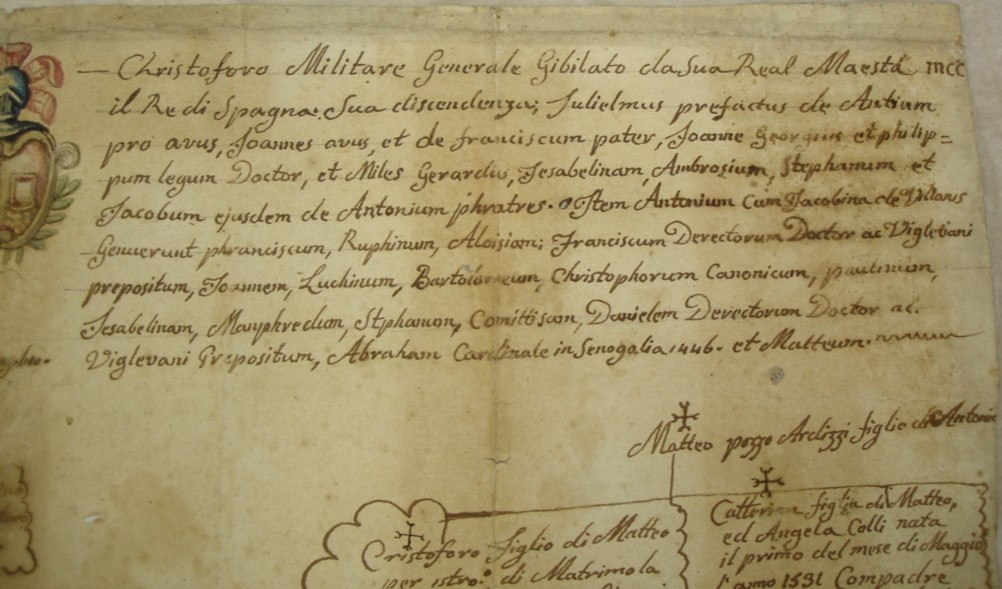 "— Christoforo Militare Generale Giubilato da Sua Real Maestà il Re di Spagna: Sua discendenza; Julielmus praefactus de Antium pro avus, Joannes avus, et de franciscum pater, Joanne Georgius et philippum legum Doctor, et Miles Gerardus, Isabellinam, Ambrosium, Stephanum et Jacobum ejusdem de Antium phratres. Item Antonium cum Jacobina de Villanis Genuerunt phraniscum, Ruphinum, Aloisium: Franciscum Decretorum Doctor ac Viglevani prepositum, Joannem, Luchinum, Bartolomeum, Christophorum Canonicum, paulinum, Isabellinam, Manphredum, Stephanum, Comitissam, Danielem Decretorum Doctor ac Viglevani Prepositum, Abraham Cardinale in Senogallia 1446. et Matteum."